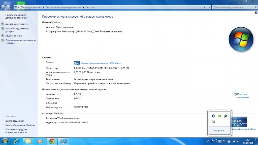 ВНИМАНИЕ: Спойлер! [ Нажмите, чтобы развернуть ][ Нажмите, чтобы скрыть ] Тип компьютера ACPI x64-based PC Операционная система Microsoft Windows 7 Ultimate Пакет обновления ОС Service Pack 1 Internet Explorer 9.0.8112.16421 (IE 9.0) DirectX DirectX 11.0 Имя компьютера АЛЕКСАНДР-ПК Имя пользователя Саша Вход в домен АЛЕКСАНДР-ПК Дата / Время 2014-08-09 / 13:24 Системная плата Тип ЦП QuadCore Intel Core 2 Quad Q9550, 2833 MHz (8.5 x 333) Системная плата Asus P5Q-E (2 PCI, 2 PCI-E x1, 3 PCI-E x16, 4 DDR2 DIMM, Audio, Dual Gigabit LAN, IEEE-1394) Чипсет системной платы Intel Eaglelake P45 Системная память 4096 МБ (DDR2-800 DDR2 SDRAM) DIMM1: Kingston 2 ГБ DDR2-800 DDR2 SDRAM (6-6-6-18 @ 400 МГц) (5-5-5-15 @ 333 МГц) (4-4-4-12 @ 266 МГц) DIMM2: Corsair XMS2 CM2X1024-6400 1 ГБ DDR2-800 DDR2 SDRAM (5-5-5-18 @ 400 МГц) (4-4-4-13 @ 270 МГц) DIMM3: Corsair XMS2 CM2X1024-6400 1 ГБ DDR2-800 DDR2 SDRAM (5-5-5-18 @ 400 МГц) (4-4-4-13 @ 270 МГц) Тип BIOS AMI (04/06/09) Коммуникационный порт Последовательный порт (COM1) Отображение Видеоадаптер NVIDIA GeForce 9600 GT (512 МБ) Видеоадаптер NVIDIA GeForce 9600 GT (512 МБ) 3D-акселератор nVIDIA GeForce 9600 GT Монитор Универсальный монитор PnP [NoDB] (HMCS306395) Мультимедиа Звуковой адаптер Analog Devices AD2000B @ Intel 82801JB ICH10 - High Definition Audio Controller Хранение данных Контроллер IDE Стандартный двухканальный контроллер PCI IDE Контроллер IDE Стандартный двухканальный контроллер PCI IDE Контроллер IDE Стандартный двухканальный контроллер PCI IDE Контроллер хранения данных Microsoft iSCSI инициатор Флоппи-накопитель Дисковод Дисковый накопитель ST31000524AS ATA Device (1000 ГБ, 7200 RPM, SATA-III) Оптический накопитель HL-DT-ST DVDRAM GH40F ATA Device SMART-статус жёстких дисков OK Разделы C: (NTFS) 454.9 ГБ (366.1 ГБ свободно) E: (NTFS) 476.6 ГБ (475.9 ГБ свободно) Общий объём 931.4 ГБ (842.0 ГБ свободно) Ввод Клавиатура Клавиатура HID Мышь HID-совместимая мышь Сеть Первичный адрес IP 192.168.1.7 Первичный адрес MAC 00-26-18-AA-77-89 Сетевой адаптер Marvell Yukon 88E8001/8003/8010 PCI Gigabit Ethernet Controller (192.168.1.7) Сетевой адаптер Marvell Yukon 88E8056 PCI-E Gigabit Ethernet Controller Периферийные устройства Принтер Fax Принтер Microsoft XPS Document Writer Контроллер FireWire AT&T/Lucent IEEE1394 FireWire Controller (PHY: Agere LFW3226/3227) Контроллер USB1 Intel 82801JB ICH10 - USB Universal Host Controller Контроллер USB1 Intel 82801JB ICH10 - USB Universal Host Controller Контроллер USB1 Intel 82801JB ICH10 - USB Universal Host Controller Контроллер USB1 Intel 82801JB ICH10 - USB Universal Host Controller Контроллер USB1 Intel 82801JB ICH10 - USB Universal Host Controller Контроллер USB1 Intel 82801JB ICH10 - USB Universal Host Controller Контроллер USB2 Intel 82801JB ICH10 - USB2 Enhanced Host Controller Контроллер USB2 Intel 82801JB ICH10 - USB2 Enhanced Host Controller USB-устройство USB-устройство ввода USB-устройство USB-устройство ввода USB-устройство USB-устройство ввода USB-устройство Составное USB устройство Батарея Составная батарея (Майкрософт) DMI DMI поставщик BIOS American Megatrends Inc. DMI версия BIOS 2101 DMI производитель системы System manufacturer DMI система System Product Name DMI системная версия System Version DMI системный серийный номер System Serial Number DMI системный UUID C00C001E-8C0000F0-1AE20026-18AA5BC0 DMI производитель системной платы ASUSTeK Computer INC. DMI системная плата P5Q-E DMI версия системной платы Rev 1.xx DMI серийный номер системной платы MB-1234567890 DMI производитель шасси Chassis Manufacture DMI версия шасси Chassis Version DMI серийный номер шасси Chassis Serial Number DMI Asset-тег шасси Asset-1234567890 DMI тип шасси Desktop Case DMI всего / свободных сокетов памяти 4 / 1 Фотки будут попозжа Компу примерно 5 лет. Пока все игры тянет и это меня радует С ним ничего не происходило за 5 лет даже не че не менял кроме 10 штук наушников,3 клавиатуры и 2 мышки. |