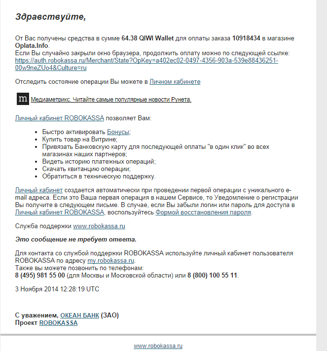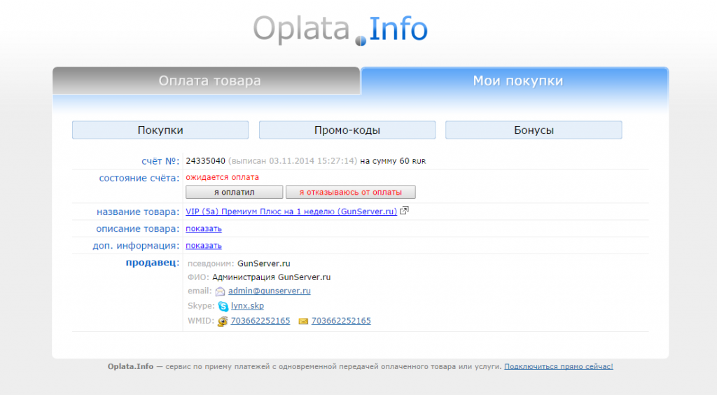 www.oplata.info и подтвердить данный факт. После получения подтверждения, покупателю автоматически будет передан товар, а на ваш счёт будут зачислены оплаченные им средства. В случае возникновения трудностей у покупателя, попросите его написать нам на