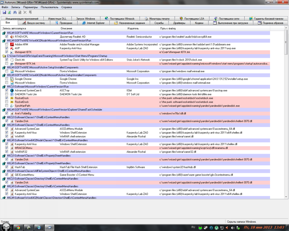 Наткнулся в инете на бесплатную программку AutoRuns-является аналогом обычному Msconfig в вкладке выполнить,но показывает не только запущенные службы и процессы,но также и детальную информацию (из какой ветки реестра запущено,для какой учетной записи) в общем функционал обширный,при стандартном ctrl+alt+del у меня высвечивается 48 запущенных процессов,на деле оказалось что порядка 100-в принципе на скорость они не влияют но тот факт удивил что допустим Acronis который я удалил еще полгода назад оказывается оставил два каких-то глубинных процесса,которые я не нашел в реестре,и такие утилиты как регклинер и ссклинер(постоянно ими чищу машину) не смогли их найти также нашел файлы драйверов которые периодически пытаются пройти верификацию,хотя я уже давно поставил новые на видюху предварительно убив старые