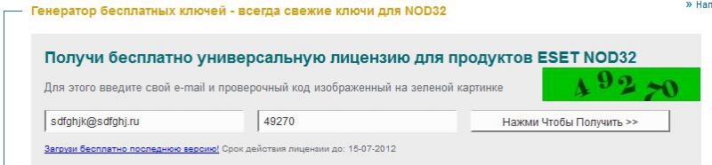 Так же есть неофициальный сайт NOD-32 где всегда есть триальные ключики на месяц, необходимо ввести любой выдуманный e-mail и проверочный как показано на скриншоте ниже