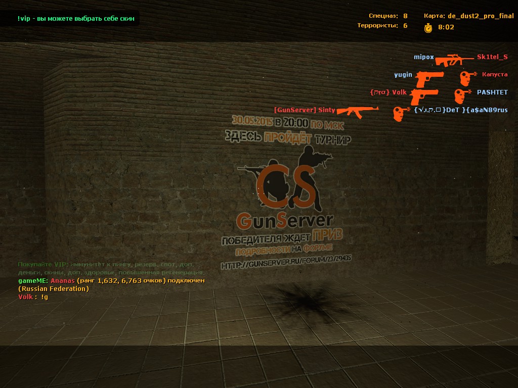 Еще мое предложение такое, запустить карту 19:30 по МСК, за пол часа до турнира, что бы все смогли скачать ее и самое главное все ВИПы смогли освоиться и привыкнуть играть без привилегий, а в 20:00 LIVE LIVE LIVE РЕСТАРТ И ПОНЕСЛАСЬ!