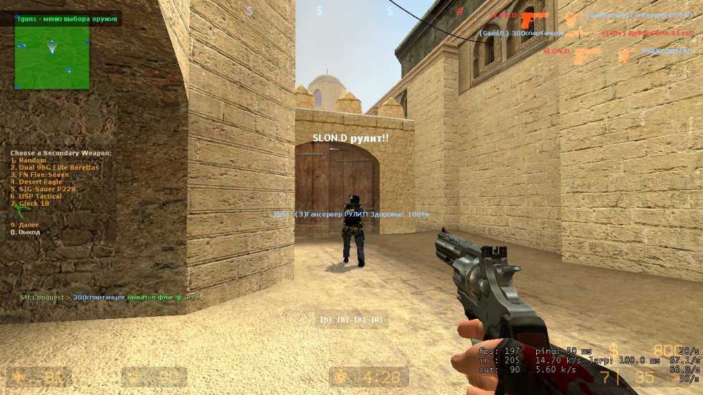 Клавина "2" скорострел и дигл --- bind kp_downarrow "say !g; wait; wait; wait; menuselect 9; wait; wait; wait; menuselect 7; wait; wait; wait; menuselect 4"