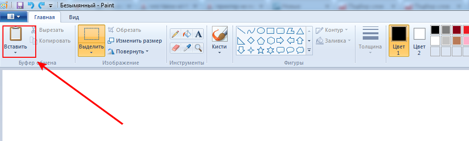 После проделанных манипуляций, изображение вашего экрана попадет в буфер обмена как изображение. Вторым шагом будет открытие любого графического редактора: paint, Photoshop или любой другой и вставка его туда, либо через меню Paint, как на скриншоте, либо через комбинацию клавиш "