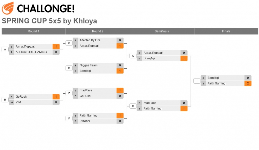 В чемпионате было зарегистрировано 10 команд, до полу финала дошли 4 сильнейшие команды. Особенно хочется отметить игру пары I в первый день - это madFace и GoRush. За весь чемпионат по мне самая потная катка, команды всю игру шли очень ровно и добрались до допов, но на допах победу вырвала команда madFace, обе команды сильно попотели, был очень зрелищный матч. Без исключения все команды старались, но первое место заняла команда Faith Gaming, они же Modest. Кто смотрит и участвует в наших чемпионатах уже знает эту команду по другим нашим эвентам. Поздравляем ребят с победой и с почетным первым местом!