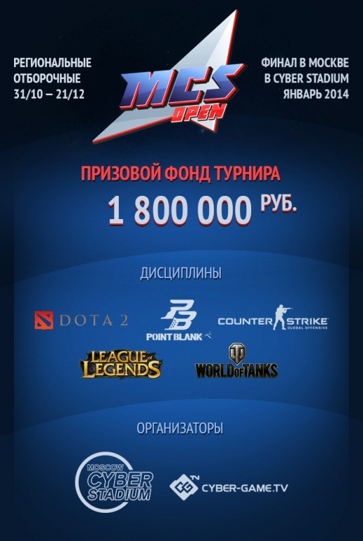 Ждать осталось совсем недолго - региональные отборочные скоро начнутся в нашем регионе. Вам же теперь остается только собрать команду и победить с ней всех соперников. В январе 2015 года вы сможете сразится с лучшими командами со всего СНГ за титул чемпиона MCS Open! Гранд-финал будет проводиться в двух форматах: Online и LAN. В каждой дисциплине форматы разнятся. Команды, победившие в региональных отборочных в дисциплинах Dota 2 и Counter-Strike:Global Offensive приедут в Moscow Cyber Stadium и уже в Москве будут бороться за звание сильнейшего коллектива СНГ. Лучшие команды регионов в дисциплинах League Of Legends, World Of Tanks, Point Blank будут принимать участие в Гранд финале на своих региональных площадках в формате онлайн. Следили за новостями, впереди много всего интересного! |