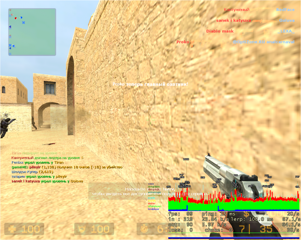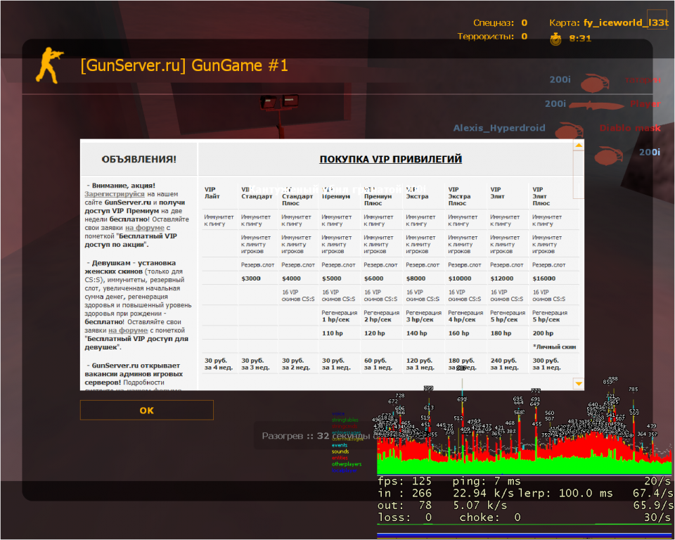С того момента как перешли на нового провайдера пинг держится стабильно от 55 до 70 мск (до этого постоянно был 100-110 мск), FPS все время от 130 до 270, но почему то не понятно что вот именно FPS эту неделю проседает до 50 хотя игроков на серве не много. Раньше такое было пару раз да и то только при максимальном кол-ве нахождение игроков на сервере и когда игроков 10-15 пересекаются в одной точке.