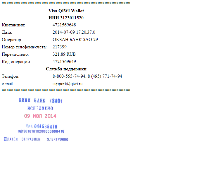 счёт №: 20686934 (выписан 07.07.2014 18:56:18) на сумму 300 RUR