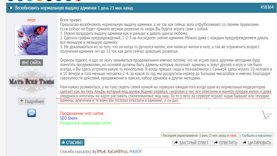1) меня ни сколько не волнует рождение проектов у игроков с нашего сервера, я знал о твоём сервере и раньше, мне было фиолетово
