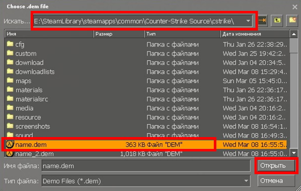 • При этом в имени файла не должно быть специальных символов и пробелов. Демонстрационный файл (расширение .dem) сохраняется в каталоге игры, дефолт ..\Steam\steamapps\common\Counter-Strike Source\cstrike . Вы можете начать запись в любое время в запущенной игре и остановить запись введя в консоль команду stop.